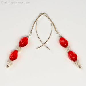 Zij past uitstekend bij de oorbellen in rood en zilver: